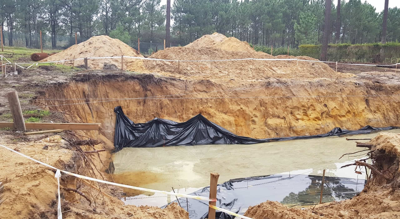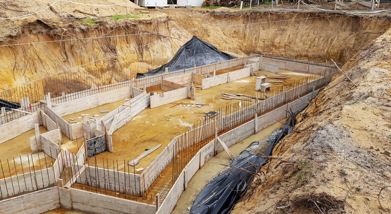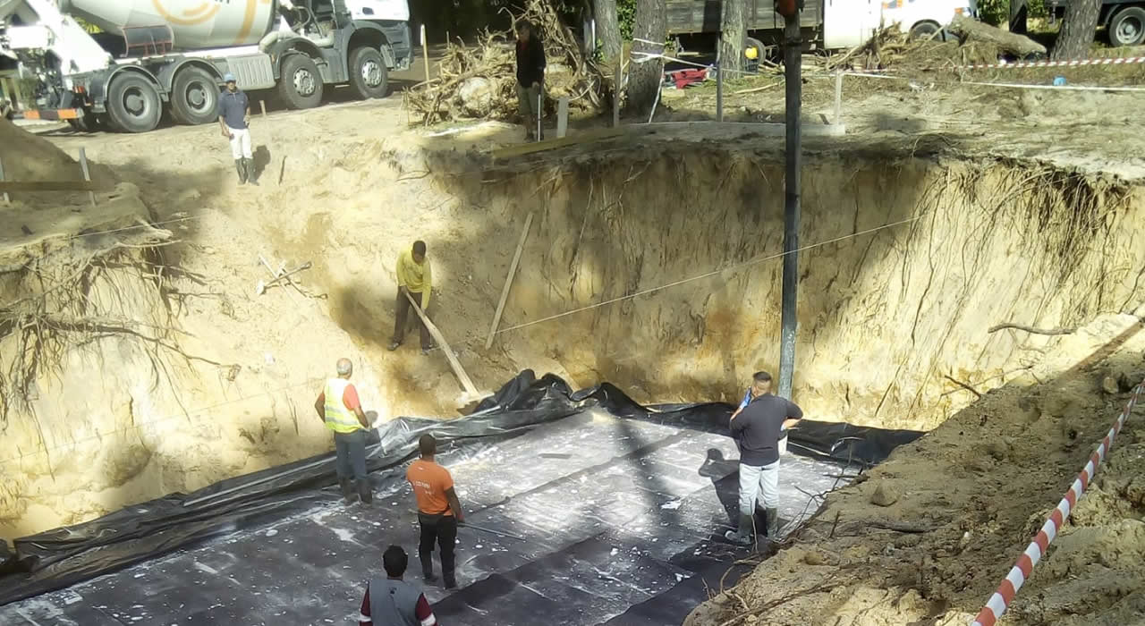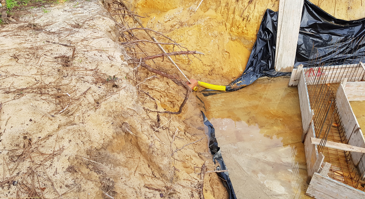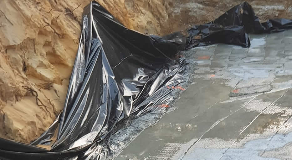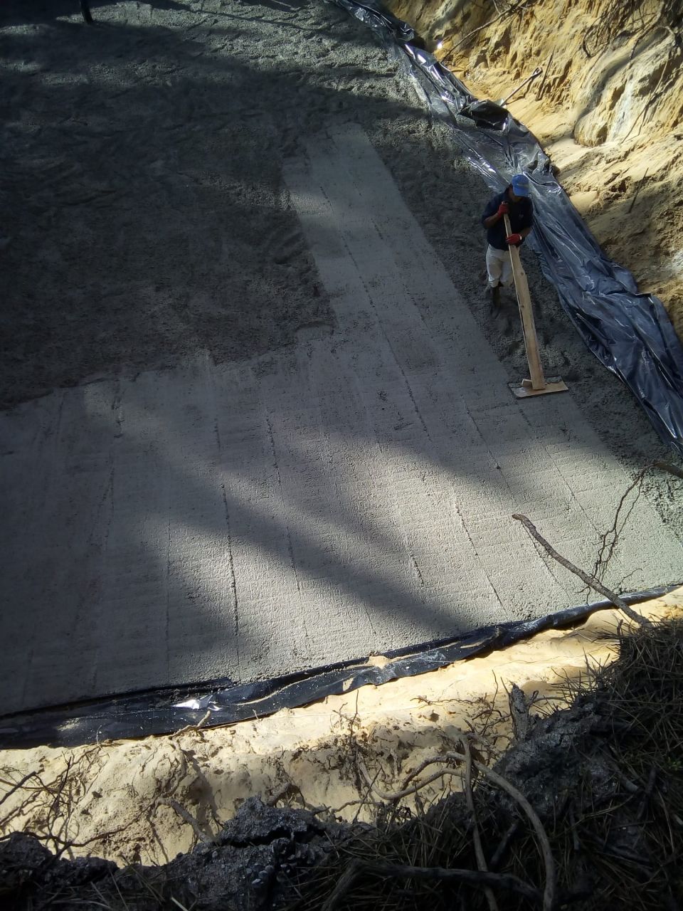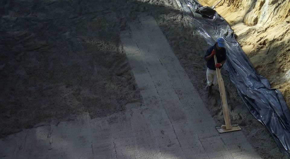 Schrik niet, dit wordt slechts de 'werkvloer'. Op deze plaat beton komt de fundering te liggen. Het idee was om, in elk geval de kelder, te gaan bouwen in een grote plastic zak. De aannemer was niet zo goed in z'n Engels, maar het woord condoom kende hij wel .. 😏